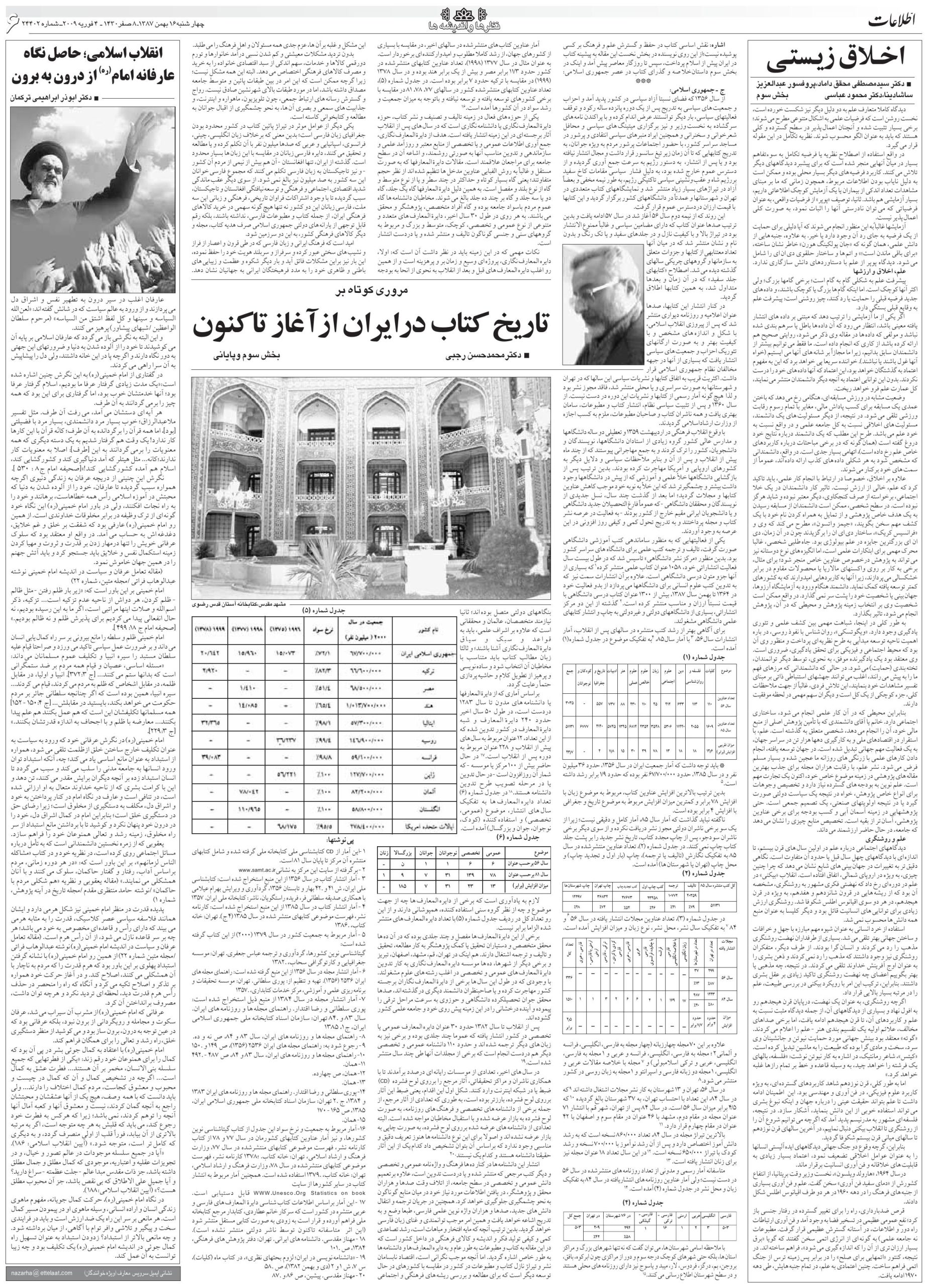 بریده ای از روزنامه ی اطلاعات . ش 24402 . چهارشنبه : 16 بهمن 1387 . ص 6 . مقاله ی تاریخ کتاب در ایران – ستون اول مقاله – پایین جدول 3 –