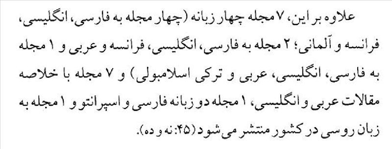 کتاب مروری کوتاه بر تاریخ کتاب در ایران از آغاز تا کنون . نویسنده : محمد حسن رجبی. انتشارات اطلاعات . چاپ اول – سال 1388 خورشیدی- ص 59 📖 در ایران طبق آمار سال 1384 مجله ای به دو زبان فارسی و اسپرانتو منتشر می شده است .