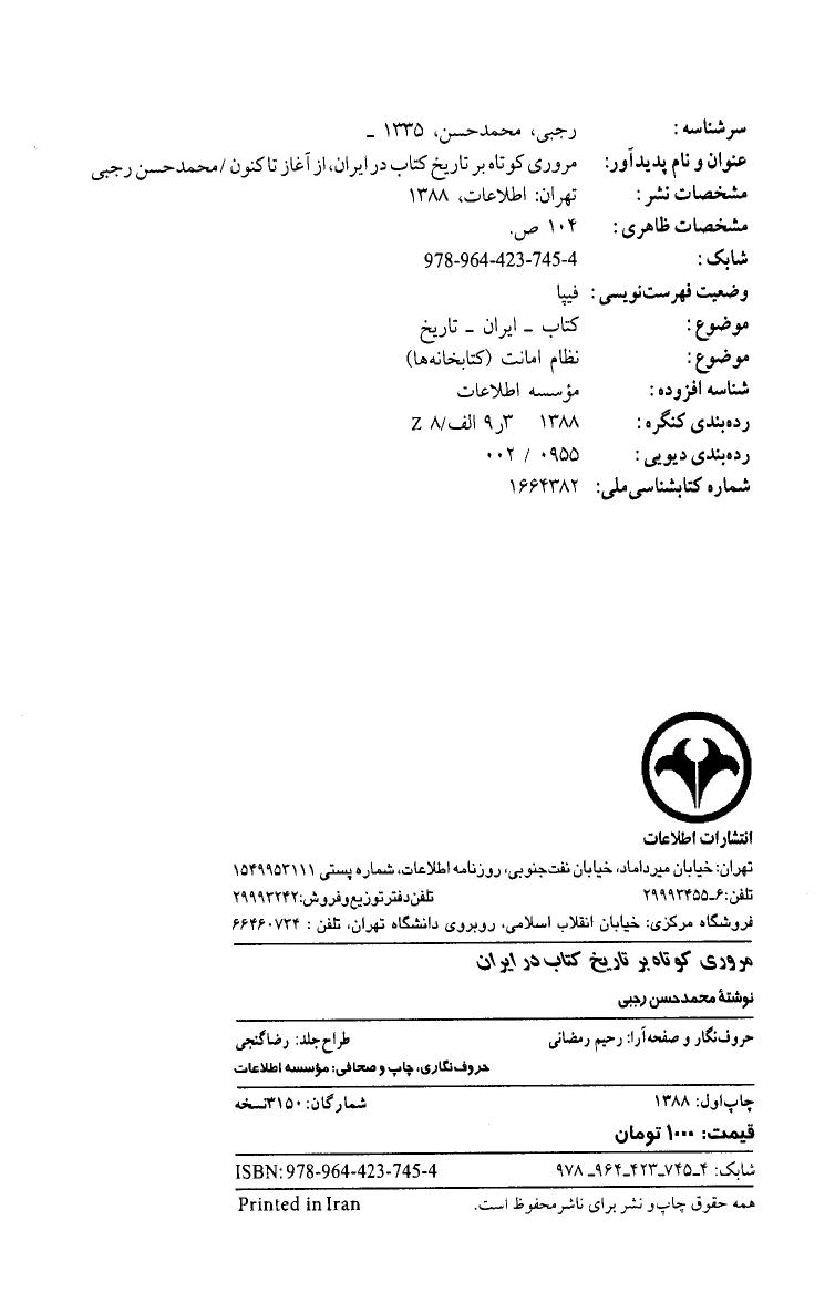 کتاب مروری کوتاه بر تاریخ کتاب در ایران از آغاز تا کنون . نویسنده : محمد حسن رجبی. انتشارات اطلاعات . چاپ اول – سال 1388 خورشیدی- 📚 صفحه ی شناسنامه