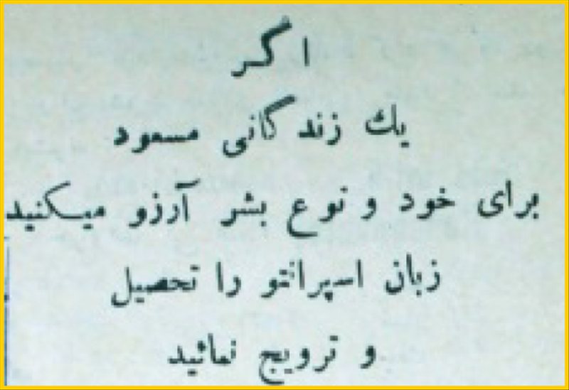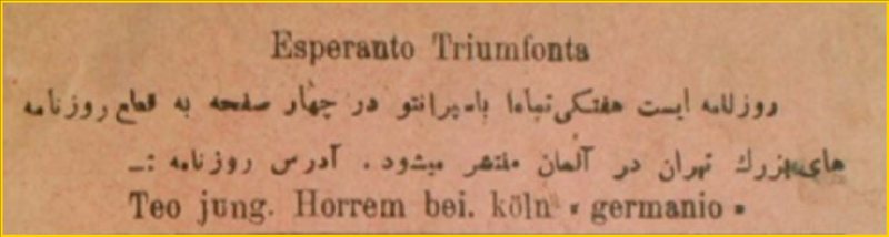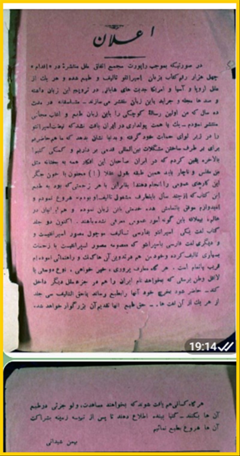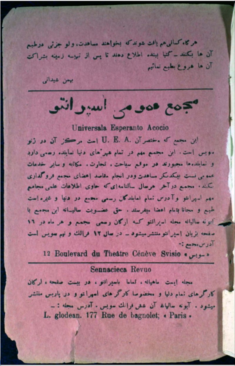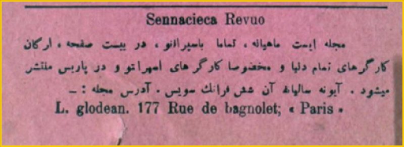 📙 عبارت « نشریه دوم » در بالا احتمالا بدان دلیل است که از بهمن شیدانی در سال ۱۲۹۳ ، رساله ای کوچک درباره ی زبان اسپرانتو منتشر شده است و شاید آن نشریه ی اول بوده باشد .
