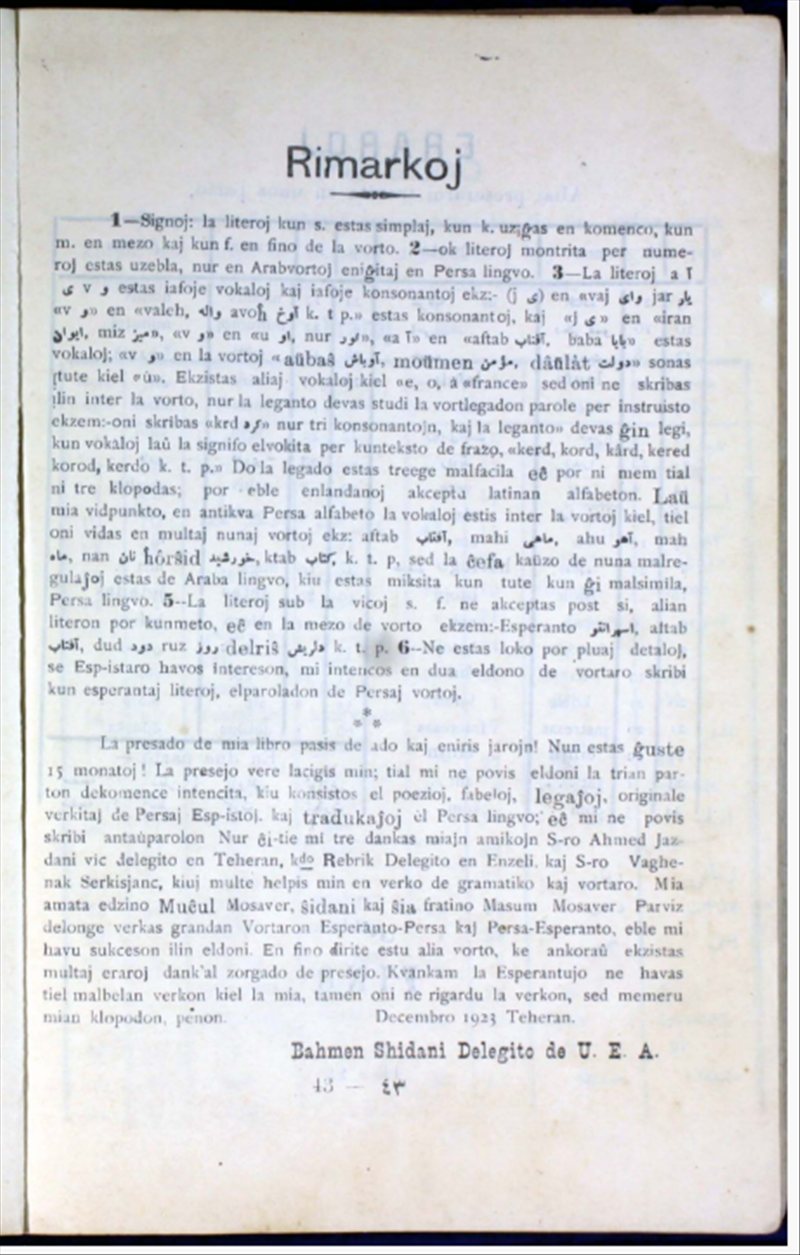⭐️ اشاره ی بهمن شیدانی به رساله ای که وی ده سال قبل درباره ی زبان اسپرانتو منتشر نموده است ( این رساله همان است که در سال ۱۲۹۳ توسط بهمن شیدانی منتشر شده است . رجوع شود به سالنامه ی پارس سال ۱۳۰۶ ) .