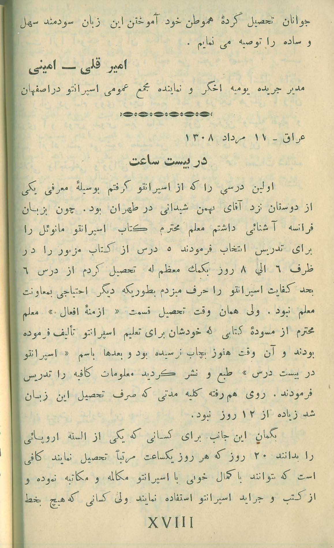 ![کتاب لسان عمومی اسپرانتو تالیف : بهمن شیدانی ناشر : تهران . چاپخانه ی فردوسی تاریخ انتشار : طبع دوم - سال ۱۳۰۸ خورشیدی ص ۱۸ یا XVIII از بخش اول . 📚 دهمین صفحه از مطلبی شانزده صفحه ای درباره ی دیدگاه ۱۳ اسپرانتودان پیرامون سادگی زبان اسپرانتو . ✉️ دو خط پایانی دیدگاه و نامه ی امیرقلی امینی + نامه ی رضا طاهری 📗 توصیه ی امیر قلی امینی به جوانان تحصیل کرده ی هم وطن جهت آموختن زبان اسپرانتو . 📕اشاره ی رضا طاهری به فراگیری زبان اسپرانتو در نزد بهمن شیدانی توسط کتاب اسپرانتو مانوئل به زبان فرانسه و ادامه ی آموزش با کتاب هنوز منتشر نشده ی اسپرانتو در بیست درس [ پس نتیجه آن که ، این قضیه باید قبل از ۱۳۰۲ باشد ] . کتاب لسان عمومی اسپرانتو تالیف : بهمن شیدانی ناشر : تهران . چاپخانه ی فردوسی تاریخ انتشار : طبع دوم - سال ۱۳۰۸ خورشیدی ص ۱۸ یا XVIII از بخش اول . 📚 دهمین صفحه از مطلبی شانزده صفحه ای درباره ی دیدگاه ۱۳ اسپرانتودان پیرامون سادگی زبان اسپرانتو . ✉️ دو خط پایانی دیدگاه و نامه ی امیرقلی امینی + نامه ی رضا طاهری 📗 توصیه ی امیر قلی امینی به جوانان تحصیل کرده ی هم وطن جهت آموختن زبان اسپرانتو . 📕اشاره ی رضا طاهری به فراگیری زبان اسپرانتو در نزد بهمن شیدانی توسط کتاب اسپرانتو مانوئل به زبان فرانسه و ادامه ی آموزش با کتاب هنوز منتشر نشده ی اسپرانتو در بیست درس [ پس نتیجه آن که ، این قضیه باید قبل از ۱۳۰۲ باشد ] .](https://bibliografio.ir/wp-content/uploads/2025/10/Lesane-Omumi-Shidani_Page_021.jpg)