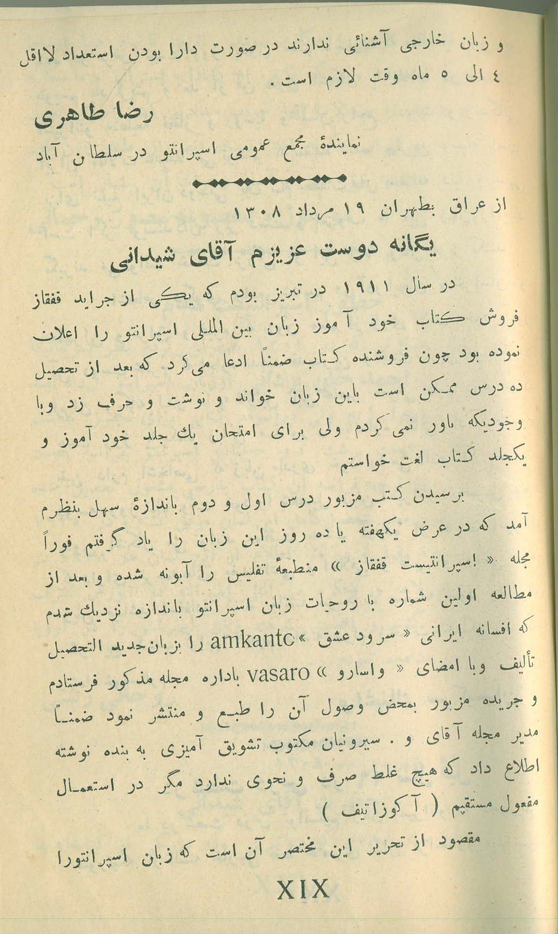 ![کتاب لسان عمومی اسپرانتو تالیف : بهمن شیدانی ناشر : تهران . چاپخانه ی فردوسی تاریخ انتشار : طبع دوم - سال ۱۳۰۸ خورشیدی ص ۱۹ یا XIX از بخش اول . 📚 یازدهمین صفحه از مطلبی شانزده صفحه ای درباره ی دیدگاه ۱۳ اسپرانتودان پیرامون سادگی زبان اسپرانتو . ✉️ دو خط پایانی دیدگاه و نامه ی رضا طاهری + بخشی از نامه ی واغیناک سرکیسیان 📗 اشاره ی واغیناک سرکیسیان به این که در سال ۱۹۱۱ برابر با سال ۱۲۹۰ خورشیدی در یکی از مطبوعات قفقاز ، خبر فروش کتاب خودآموز زبان اسپرانتو را اعلان نموده بود و سرکیسیان کتاب مذکور را خریده است [ متاسفانه نام کتاب ذکر نشده است ] . 📕 ترجمه ی افسانه ی ایرانی ( amkanto سرود عشق ) به زبان اسپرانتو به توسط واغیناک سرکیسیان و انتشار آن در مجله ی اسپرانتیست قفقاز ( kaŭkaza Esperantisto ) با نام مستعار واسارو کتاب لسان عمومی اسپرانتو تالیف : بهمن شیدانی ناشر : تهران . چاپخانه ی فردوسی تاریخ انتشار : طبع دوم - سال ۱۳۰۸ خورشیدی ص ۱۹ یا XIX از بخش اول . 📚 یازدهمین صفحه از مطلبی شانزده صفحه ای درباره ی دیدگاه ۱۳ اسپرانتودان پیرامون سادگی زبان اسپرانتو . ✉️ دو خط پایانی دیدگاه و نامه ی رضا طاهری + بخشی از نامه ی واغیناک سرکیسیان 📗 اشاره ی واغیناک سرکیسیان به این که در سال ۱۹۱۱ برابر با سال ۱۲۹۰ خورشیدی در یکی از مطبوعات قفقاز ، خبر فروش کتاب خودآموز زبان اسپرانتو را اعلان نموده بود و سرکیسیان کتاب مذکور را خریده است [ متاسفانه نام کتاب ذکر نشده است ] . 📕 ترجمه ی افسانه ی ایرانی ( amkanto سرود عشق ) به زبان اسپرانتو به توسط واغیناک سرکیسیان و انتشار آن در مجله ی اسپرانتیست قفقاز ( kaŭkaza Esperantisto ) با نام مستعار واسارو](https://bibliografio.ir/wp-content/uploads/2025/10/Lesane-Omumi-Shidani_Page_022.jpg)