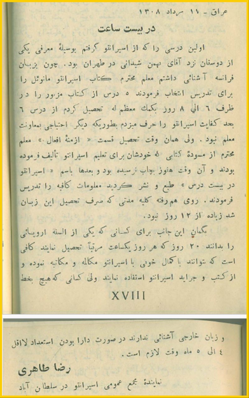 آنگاه در صفحه ی ۲۵ اما بدون شماره ی صفحه تبلیغ سالنامه ی پارس و مجله ی ایران را میتوان به دو زبان فارسی و اسپرانتو دید .