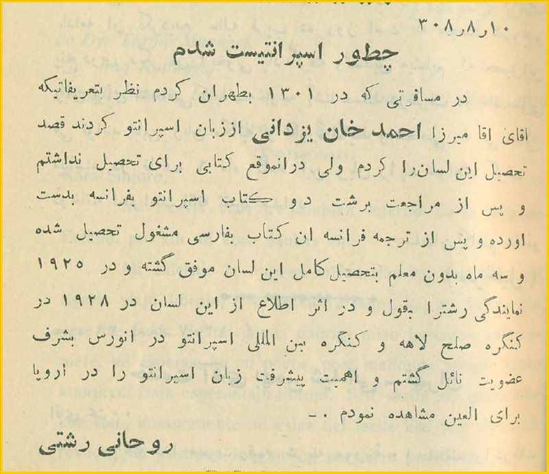 ✉️دیدگاه و نامه ی روحانی رشتی و اشاره ی او به این که به تشویق احمد یزدانی اسپرانتو را فرا گرفته است .