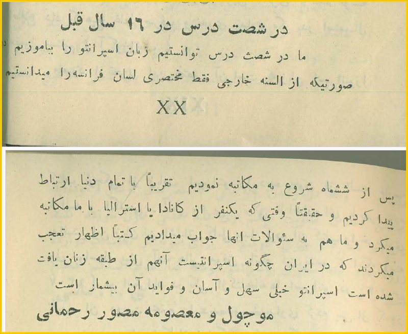 📖 دیدگاه و اظهار نظر مشترک بانوان اسپرانتودان موچول مصور رحمانی ( همسر بهمن شیدانی ) و معصومه مصور رحمانی ( خواهر زن بهمن شیدانی ) و این که شانزده سال قبل [ یعنی سال ۱۲۹۲ خ ] اسپرانتو را در شصت درس فرا گرفته اند .