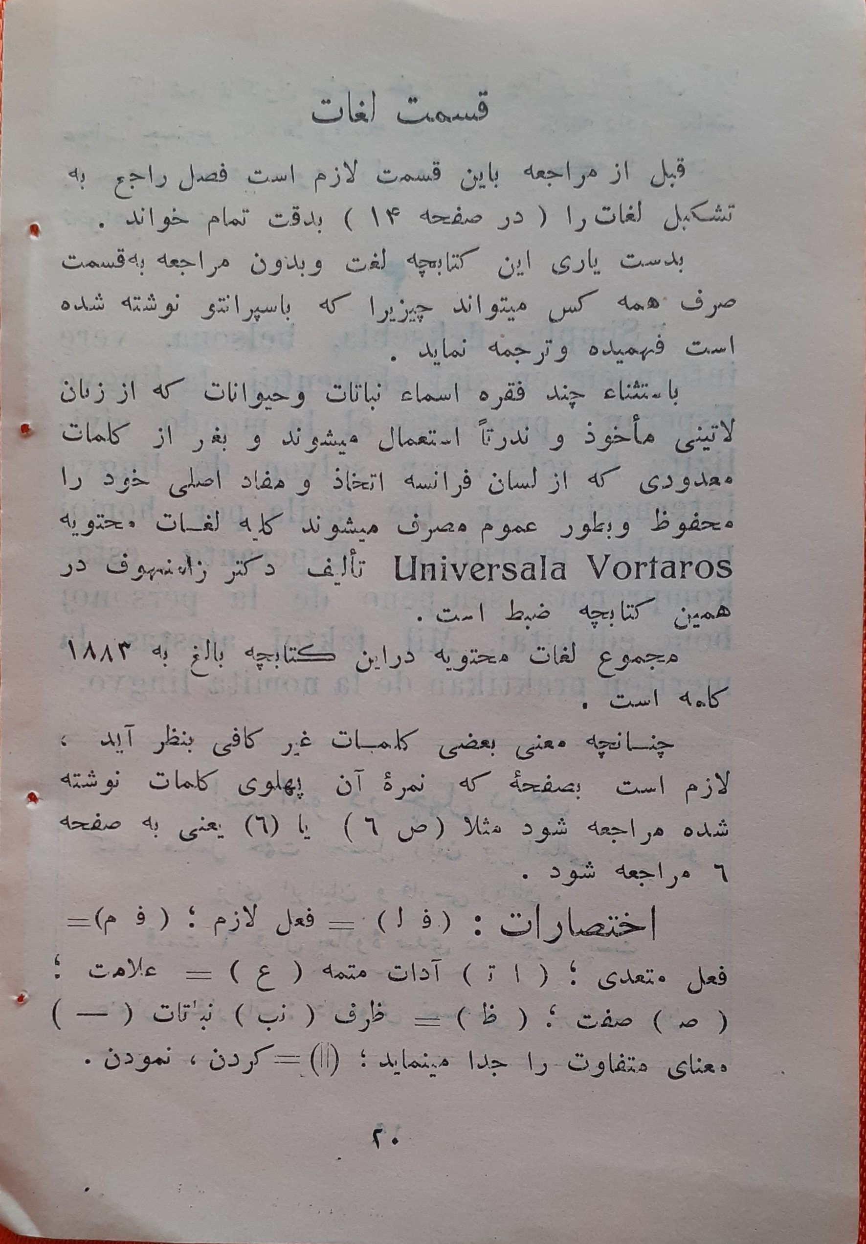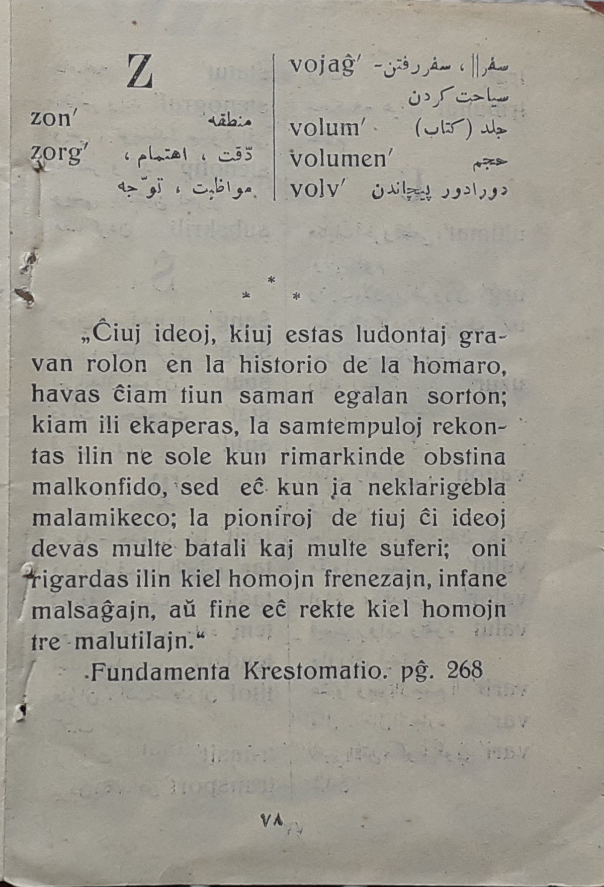 توضیح : آخرین صفحه از بخش واژه نامه همراه با متن اسپرانتوی بخشی از سخنان لودویک زامنهوف ( به نقل از کتاب Fundamenta krestomatio ) با این مضمون :