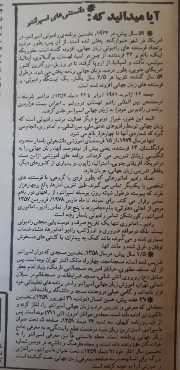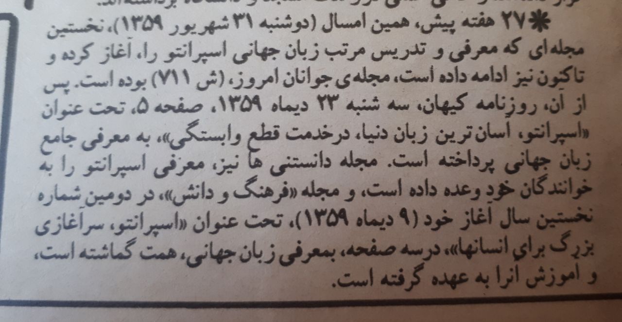 بریده ای از مجله ی جوانان امروز .ش ۷۳۸ . دوشنبه ۱۷ فروردین ۱۳۶۰ . ص ۵۹ . مدرسه ی اسپرانتو . قسمت ۲۳ . 📖 دانستنی های اسپرانتو . ذکر نام و معرفی ۴ نشریه که در آن ها دربارهی زبان اسپرانتو مطلب نوشته شده است . جوانان امروز . دانستنیها . کیهان . فرهنگ و دانش 🛎 از میان این ۴ منبع ، متاسفانه فرهنگ و دانش را در اختیار ندارم .