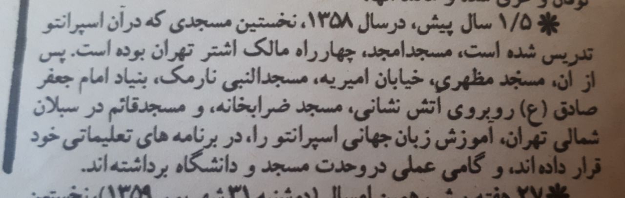 1- مسجد امجد در چهار راه مالک اشتر به عنوان نخستین مسجدی که در آن اسپرانتو تدریس شده است .