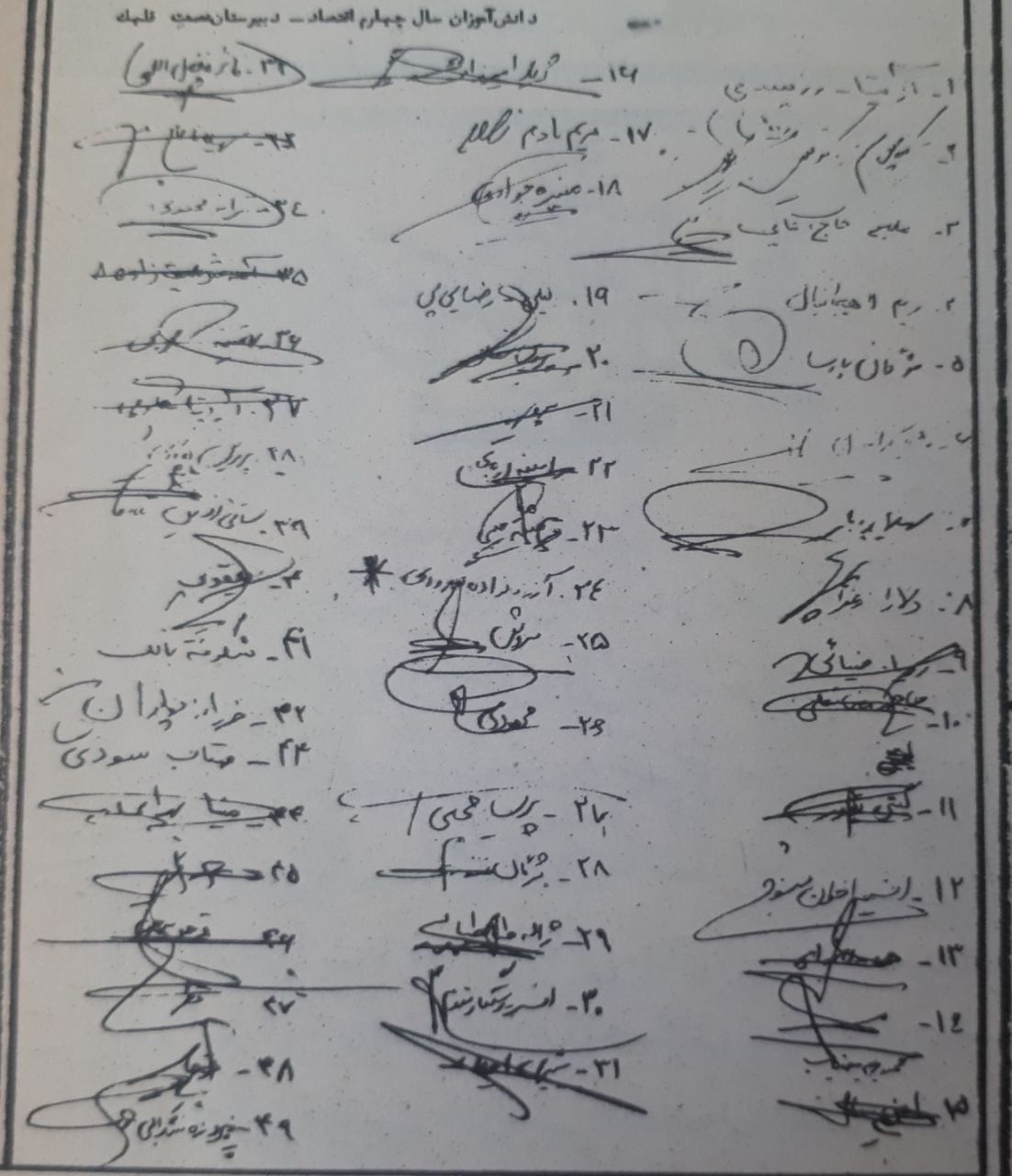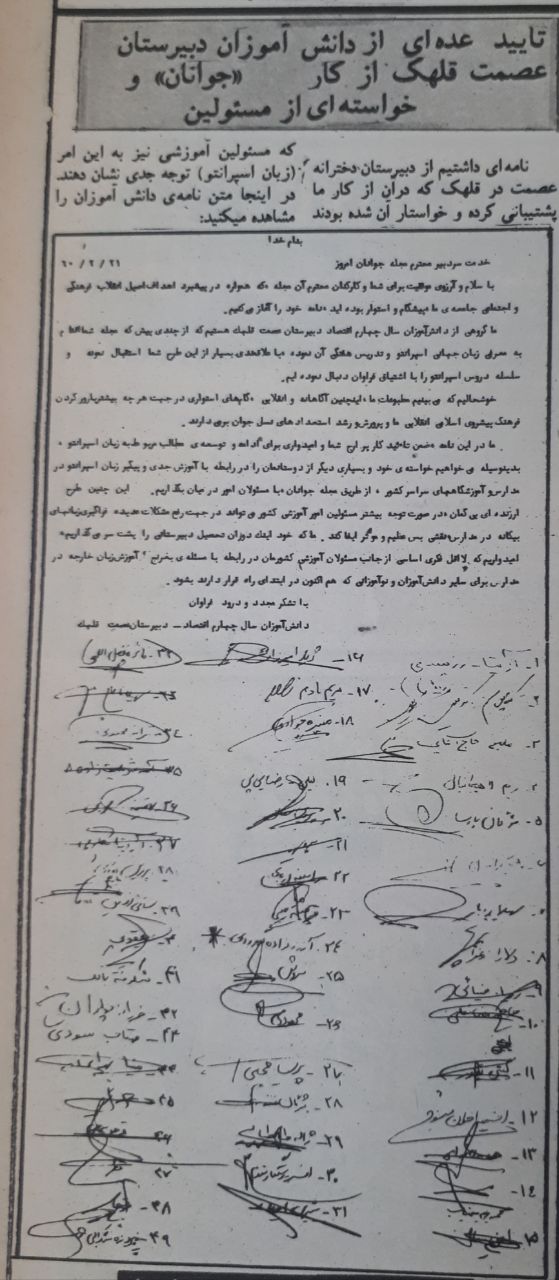 ✉️ نام و امضای دانش آموزان دبیرستان عصمت قلهک زیر نامه ی آن ها خطاب به سردبیر مجله ی جوانان امروز و تایید ابتکار مجله و حمایت از آموزش زبان اسپرانتو در مدارس کشور